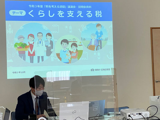 竹野絢祐(けんすけ)さんから11/11~17日までは「税を考える週間」で、国民に税の意義や役割について能動的に考えてもらい、税に対する理解を深めてもらう期間だそうです。また、少子高齢化による社会保障費の増加や国の借金が年々増え続け、令和3年度末の普通国債残高は、約990兆円と見込まれているなど、将来世代に大きな負担を残すことになる大きな課題があり、私たち世代ができることは、きちんと税金を払うことだと学びました。受講者からは、国会議員の不祥事等を考えると、憤りを感じることがあります。私利私欲ではなく国民のために、きちんと政治をして欲しいと言う意見がありました。
